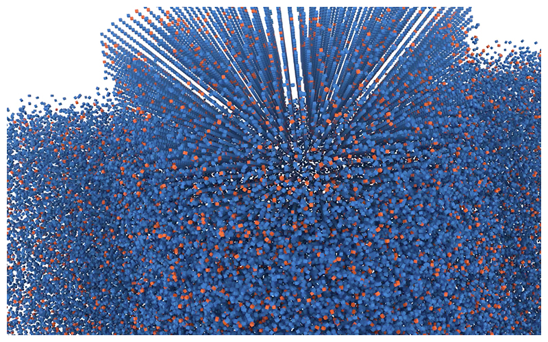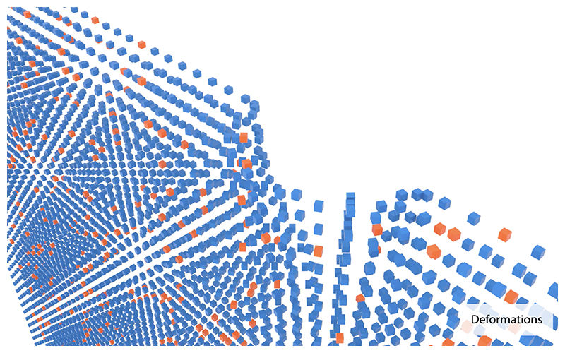 Darstellung typischer Vorgänge beim Kristallisationsprozess: Spannungen, Diffusionen, Fehlerstellenkorrekturen in einer Animation